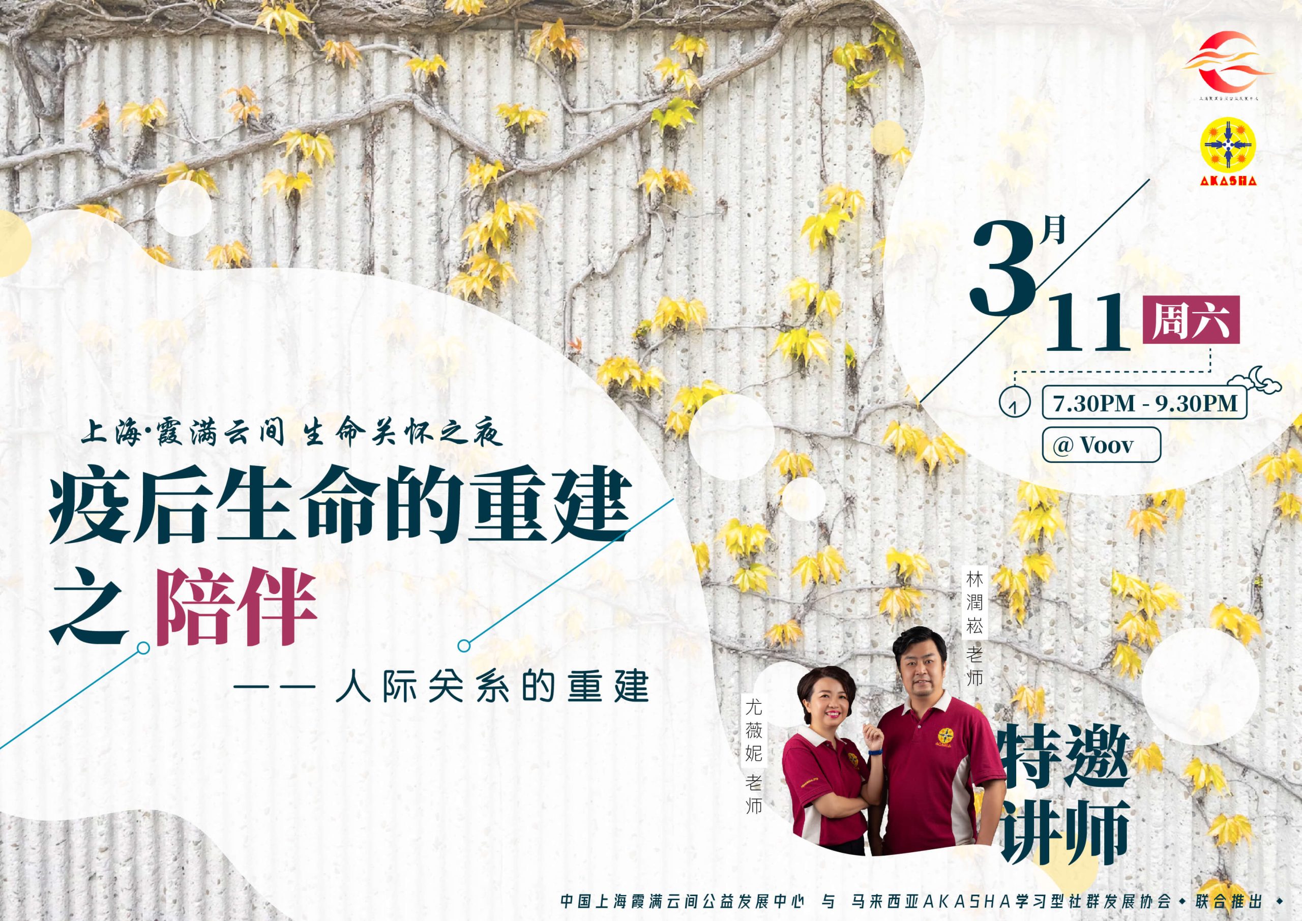 【2月22日訊】由 AKASHA 戰略合作伙伴上海霞滿雲間公益發展中心發出邀請,AKASHA 學習型社群資深生命關懷工作者林潤崧與尤薇妮老師連袂主持「上海生命關懷之夜」,將於 2023 年 3 月 11 日採用騰訊會議 VooV 線上進行 300 人的分享交流活動。當天晚上將由上海霞滿雲間公益發展中心負責人王斌院長主持,林尤兩位老師將從「生命的重建 之 陪伴」的觀點出發做出「疫後人際關係的重建」短講以及討論,之後開放發言讓參與者與主講者做深度交換角度,